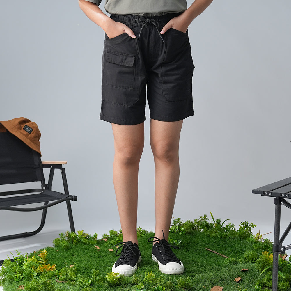 - Celana bermuda warna solid untuk effortless casual look